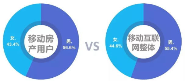 - 移动房产用户,男性占比为56.6%、女性比例43.3%;对比移动互联网整体,移动房产用户性别趋同于整体,说明房产应用本身与性别没有太大关系,只要有房产需求的用户均会使用房产类应用。
