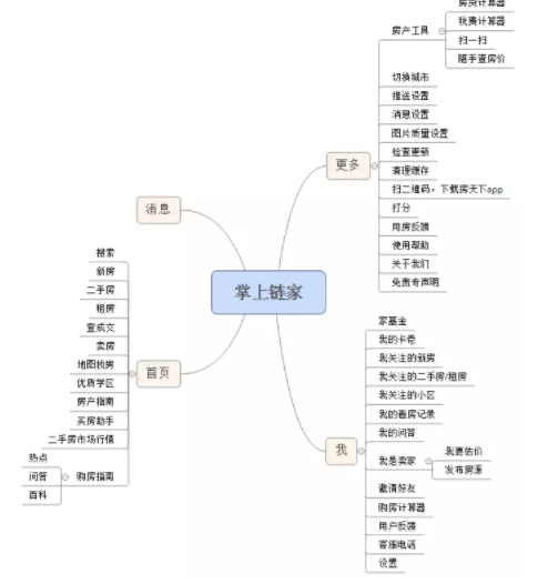 1.链家:链家的结构设计简单,基本是两个层级,各功能栏划分有序,其中“消息”功能模块设为第一层级,使得接收发送消息更为方便,学习成本低。
