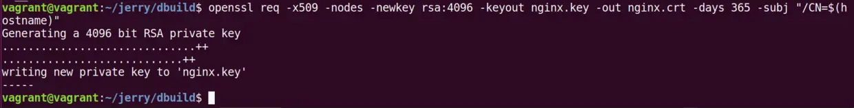 openssl req -x509 -nodes -newkey rsa:4096 -keyout nginx.key -out nginx.crt -days 365 -subj "/CN=$(hostname)"