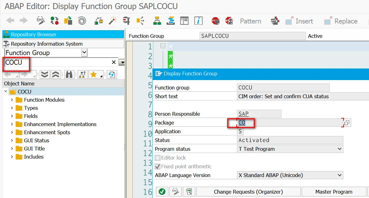 从而打开了这个程序所属的function group COCU,其对应的ABAP包为CO: