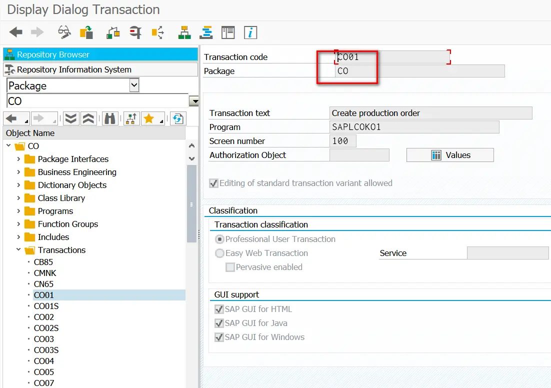 在这个package CO里,终于找到了我想要知道的事务码名称:CO01/02/03, 用于操作S/4HANA里的production order-生产订单。