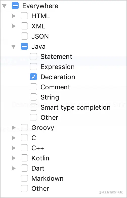 我们选择java下面的 declaration,这样他能在java的class下面和字段同级的地方使用。