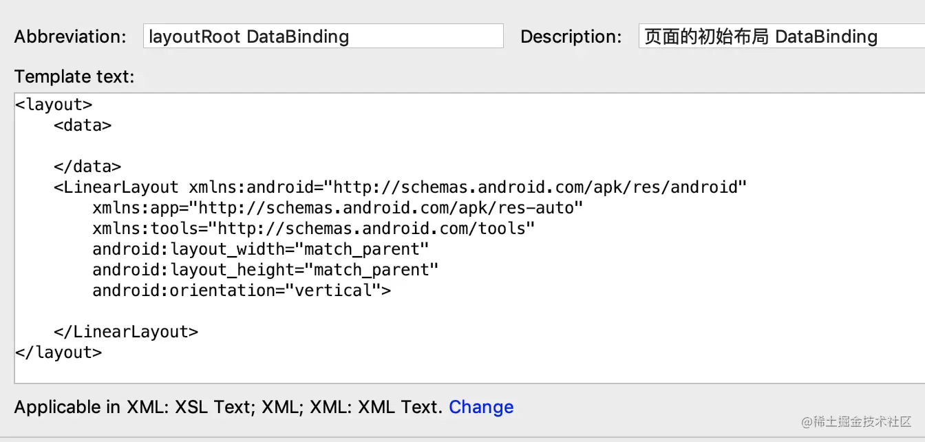 <template name="layoutRoot DataBinding" value="<layout> <data> </data> <LinearLayout xmlns:android="http://schemas.android.com/apk/res/android" xmlns:app="http://schemas.android.com/apk/res-auto" xmlns:tools="http://schemas.android.com/tools" android:layout_width="match_parent" android:layout_height="match_parent" android:orientation="vertical"> </LinearLayout> </layout>" description="页面的初始布局 DataBinding" toReformat="false" toShortenFQNames="true">