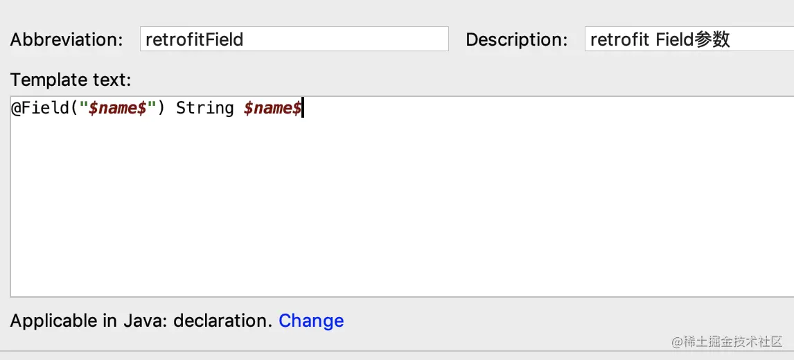 在模版里输入双美元符号包裹的属性事,如果属性名输入相同的,最后能生成相同的值。如果不为属性选择函数,就需要自己去输入值,其的用法可以参见下一节的 快速生成retrofit的field注解 。