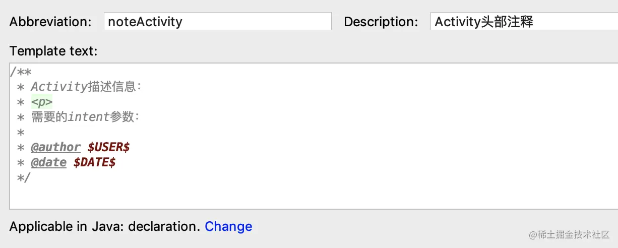 <template name="noteCommon" value="/** * 类描述信息: * * @author $USER$ * @date $DATE$ */ " description="java类头部注释" toReformat="false" toShortenFQNames="true">