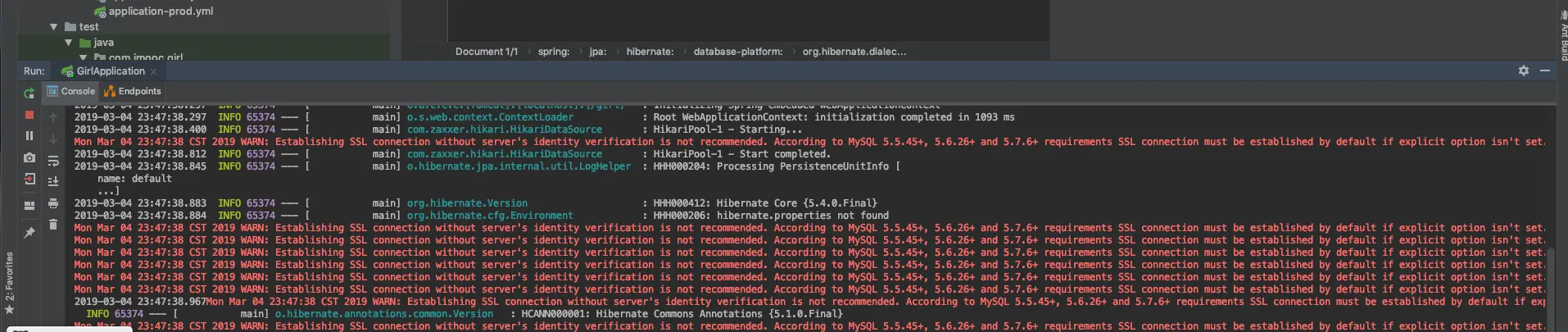 WARN: Establishing SSL connection without server's identity verification is not recommended. According to MySQL 5.5.45+, 5.6.26+ and 5.7.6+ requirements SSL connection must be established by default if explicit option isn't set. For compliance with existing applications not using SSL the verifyServerCertificate property is set to 'false'. You need either to explicitly disable SSL by setting useSSL=false, or set useSSL=true and provide truststore for server certificate verification.