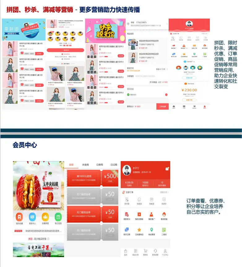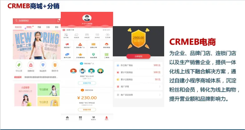 下面我将详细介绍CRMEB电商系统前端页面的展示效果 [演示地址](http:// github.crmeb.net/u/ruanjKF) 前端页面展示 商城+分销 为企业、品牌门店、连锁店以及生产销售企业、提供一体化线上线下融合解决方案,通过自建小程序商城系统、沉淀粉丝和会员