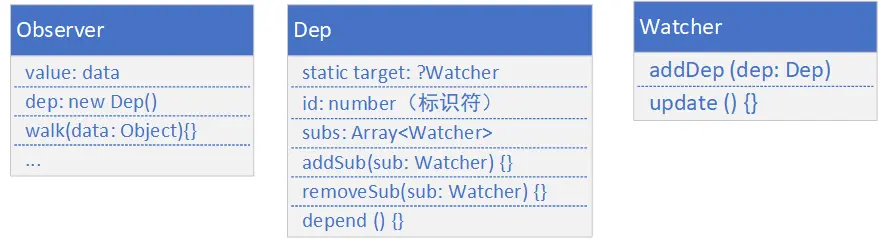 Watcher的实例化。在实例化的过程中,会调用方法get来设置Dep.target为当前Watcher实例,并且触发观察对象的getter方法,进行依赖收集。 - 图中的蓝色箭头是依赖收集的过程。观察对象的