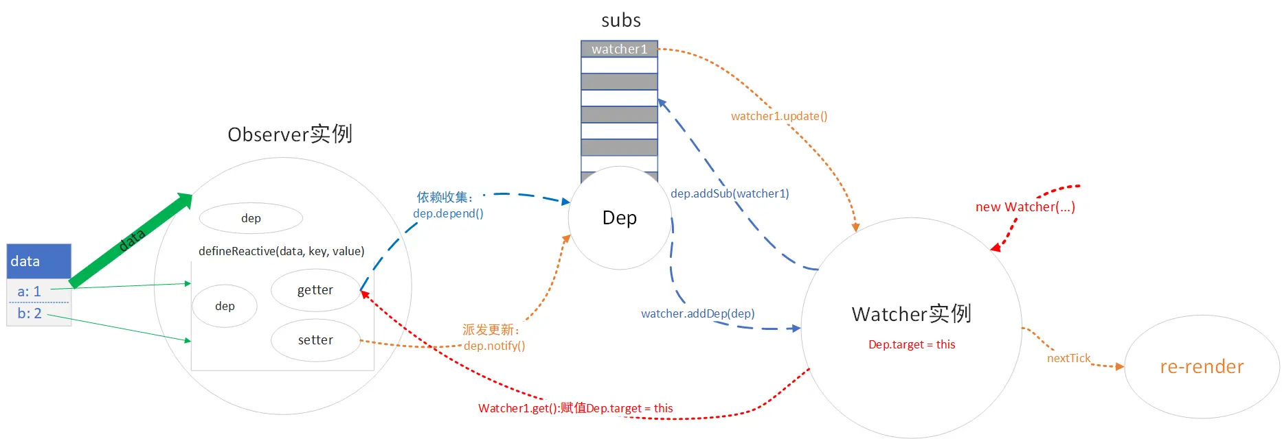 getter方法被触发,经过dep.depend()、Dep.target.addDep()和dep.addSub()等方法,会将当前观察对象的dep实例添加到Watcher实例的deps中,并且将当前Watcher实例添加到Dep的属性subs中进行统一管理。 - 图中的黄色箭头是派发更新过程。当观察对象改变后,会调用