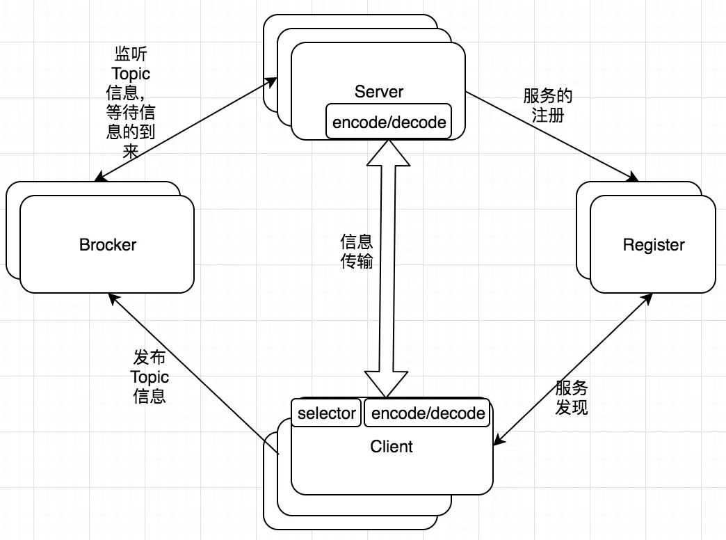 Server监听客户端的调用,和Brocker推送过来的信息进行处理。并且Server端需要向Register注册自己的存在或消亡,这样Client才能知道自己的状态。