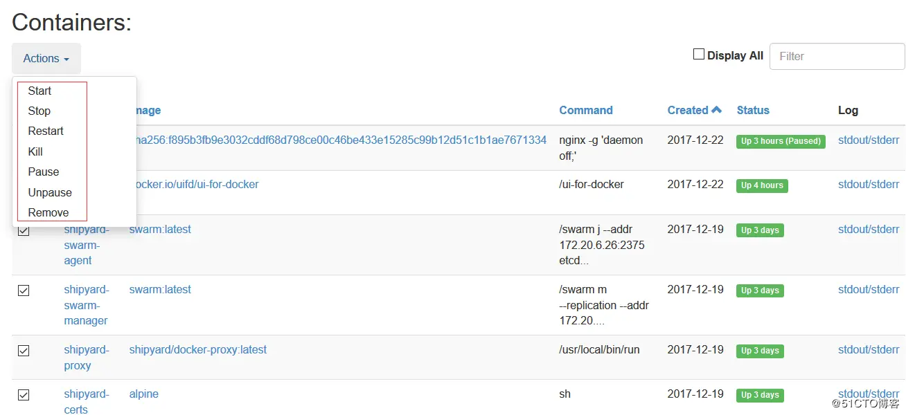 DockerUI基于Docker API,提供等同Docker命令行的大部分功能,支持container管理,image管理。