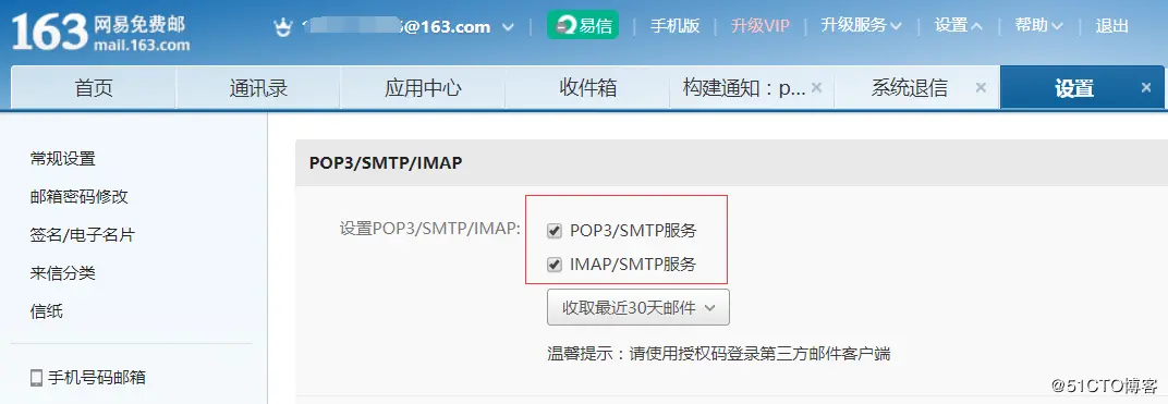 jenkins有内置的邮件功能但由于其对于成功的发布不会发送邮件可定制化程度低,在此直接配置插件邮件(Editable Email Notification),2.32以上版本的jenkins,常用的插件都已经在最初部署的时候安装了(如果你当初选择的是suggest的plugins)。 可以使用qq邮件服务器或163等其他邮件服务器,在此配置使用163邮箱,首先需要开启163邮箱的smtp服务。