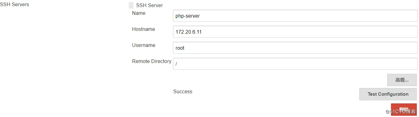 SSH Server配置 name:需要将php程序发布到目标服务器的名称,可自定义 Hostname:填写目录服务器的IP地址 Username:使用那个用户进行发布,此处为进行密钥互信的用户 Remote Directory:此出为发布到目标服务器的相对根路径,建议填写/,防止后续填写路径异常。