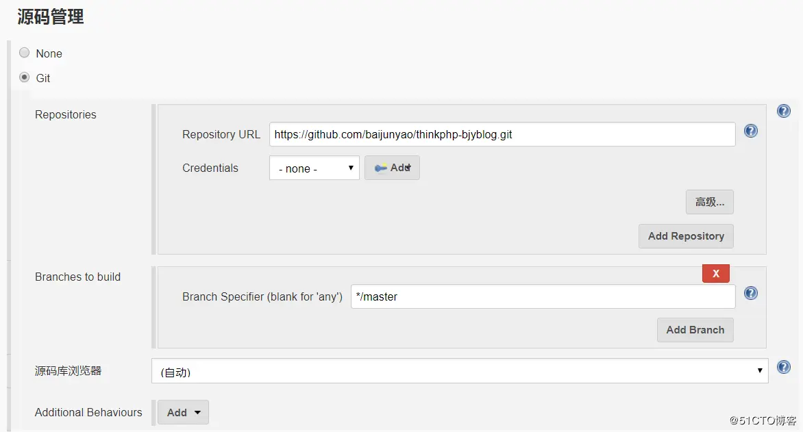 新建Item---填入项目名称---选择构建一个自由风格的软件项目---确定 源码管理选择git Repository URL 填写具体git上的仓库url,如果为私有,需要继续添加Credentials,如果为公有直接填写url即可,Credentials为none,