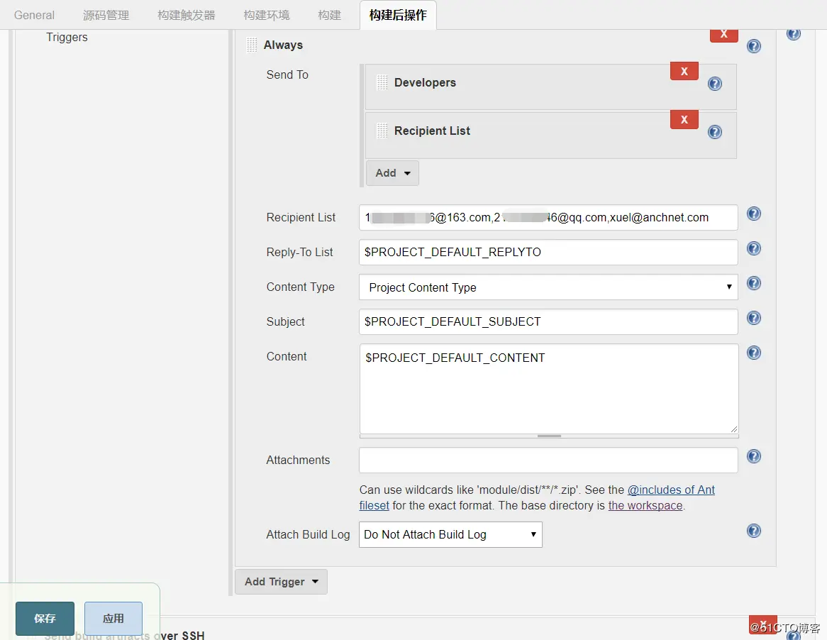 此时可以选择Editable Email Notification来构建邮件通知。 在此处,之前的邮件主题,内容均可以自定义,在高级里面,选择邮件接受人。