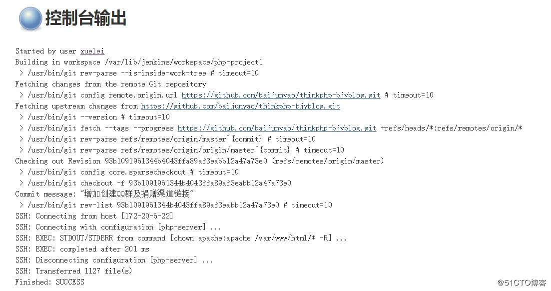 点击保存,并立即构建,可以点击console output查看日志