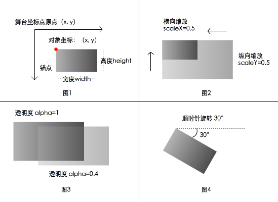 - “显示对象”,是可以在舞台上显示的对象。可以显示的对象,既包括可以直接看见的图形、文字、视频、图片等,也包括不能看见但真实存在的显示对象容器。在Egret中,视觉图形都是由显示对象和显示对象容器组成的。DisplayObject类是所有显示对象的父类,该类包含显示对象共有的属性与方法。 也可用egret.Point(x,y)在舞台上创建点对象 总之在egret中若有你看得见的对象皆为显示对象,可用显示对象.x或者.y来确定他在舞台(显示屏幕)中的位置