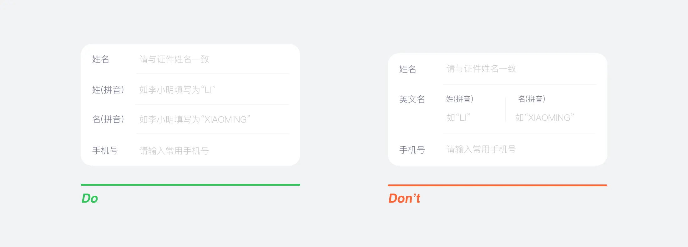 暗提示作为辅助用户填写表单的主要方式,在设计上,需要尽可能地减少视觉噪音,确保文案言简意赅,表现形式不干扰用户。因此,对比度过深或过浅,色彩过于突出的都不适合用于暗提示的视觉表现。