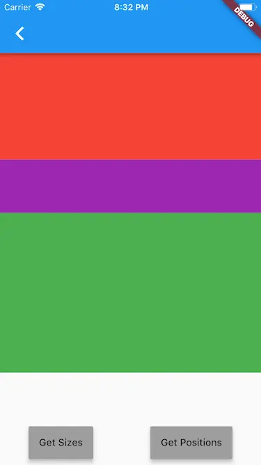 我们可以创建一个demo,在Column中画3个不同颜色的面板,分别是红、紫、绿,再在底部写两个按钮分别是 Get Sizes, Get Position.