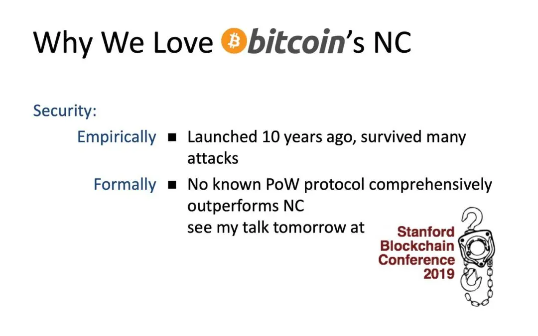 我们也喜欢比特币 NC 的安全性。比特币网络经历了很多的攻击,还是稳定运行了十年。而且严格意义上来说,目前没有任何一个已知的工作量证明共识机制在整体上超越 NC。如果你对这个话题感兴趣,可以看这里。