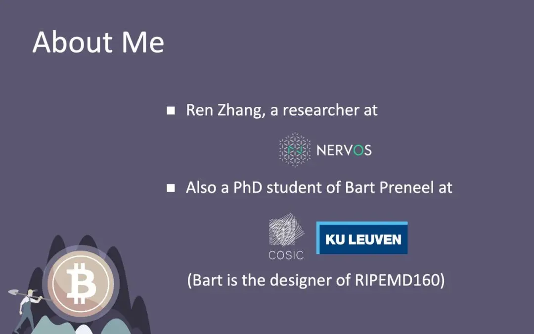 自我介绍一下,我是张韧,Nervos & Cryptape 的研究员,目前我在鲁汶大学 COSIC (Computer Security and Industrial Cryptography group) 读博士,师从 Bart Preneel。 如果你对 COSIC 不熟悉的话,不知道你是否听说过 AES,它是我们所有人的手机中使用的加密标准。