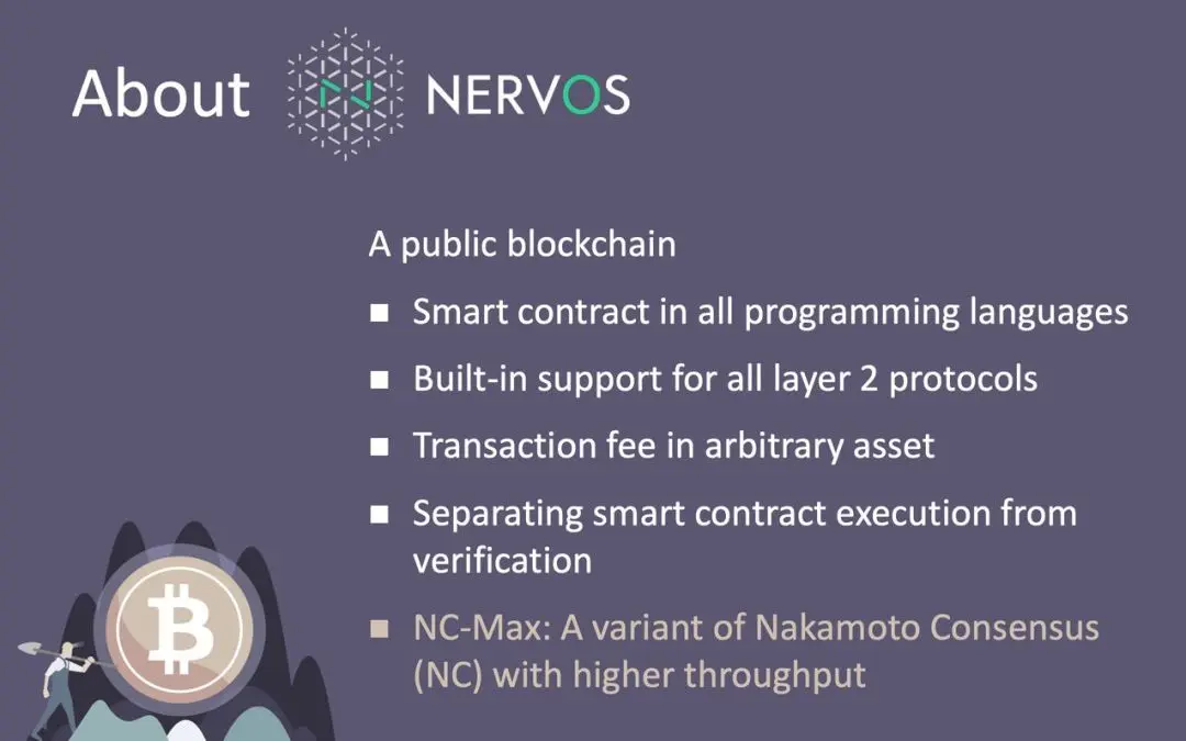 Nervos CKB 是一个公有链,能够支持各种编程语言的智能合约,以及各种各样的 Layer 2 协议。在 Nervos CKB 上你可以用任意资产支付交易手续费。在 Nervos CKB 中智能合约的执行和验证是分离的,从而达到更好的隐私和性能。最后,在 Nervos CKB 中采用了 NC-Max ——一个 Nakamoto Consensus 的变体——作为共识协议,拥有更高的吞吐量。
