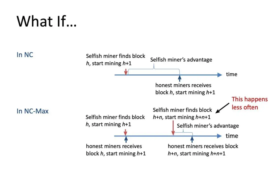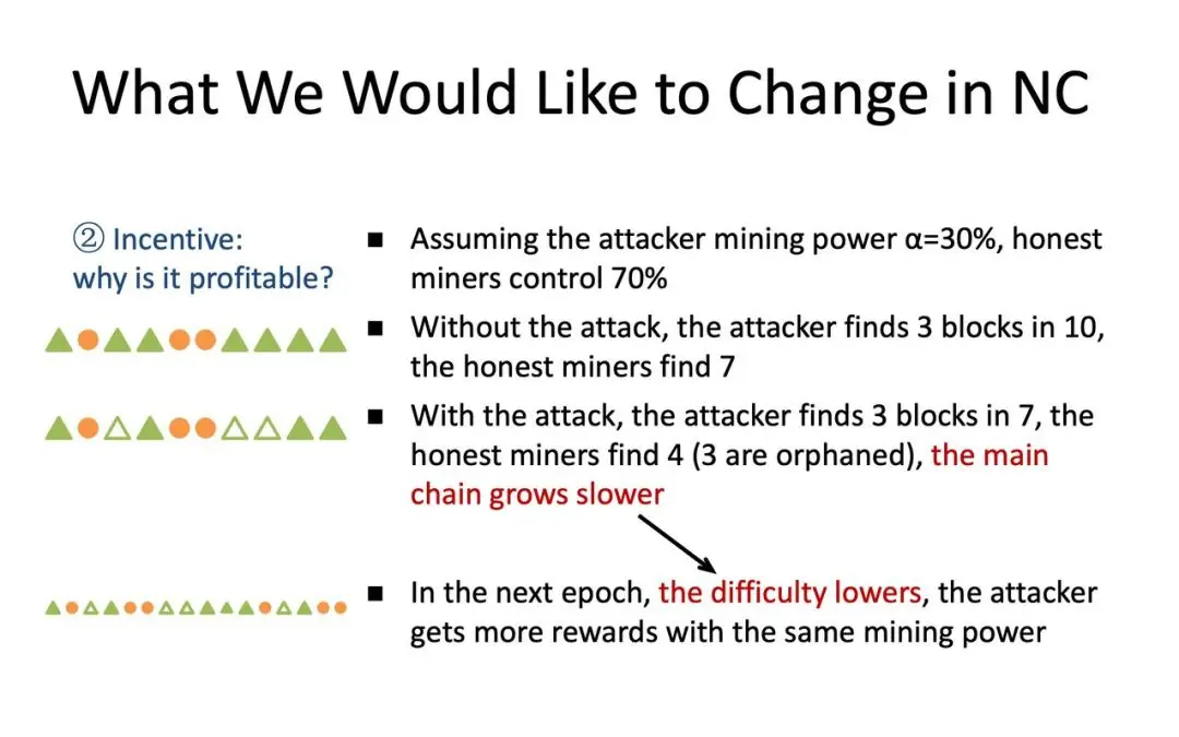 另一个我们希望在 NC 中做出改变的是它的激励问题,也就是出现自私挖矿攻击的问题。自私挖矿攻击者会扣留发现的区块,希望在网络中获得更大的领先优势。当其他诚实矿工发现区块的时候,攻击者会向网络广播这个被扣留的区块,寄希望于这个被广播的扣留区块会在诚实区块之前,被大部分诚实矿工接收到。如果攻击者足够幸运,下一个块是在攻击者的块上面进行挖矿的,那么诚实的块将会成为孤块。如果攻击者运气好到能够连续挖到多个区块,那么它将能够非常安全地让一个诚实矿工的区块失效,因为攻击者会有更长的链。