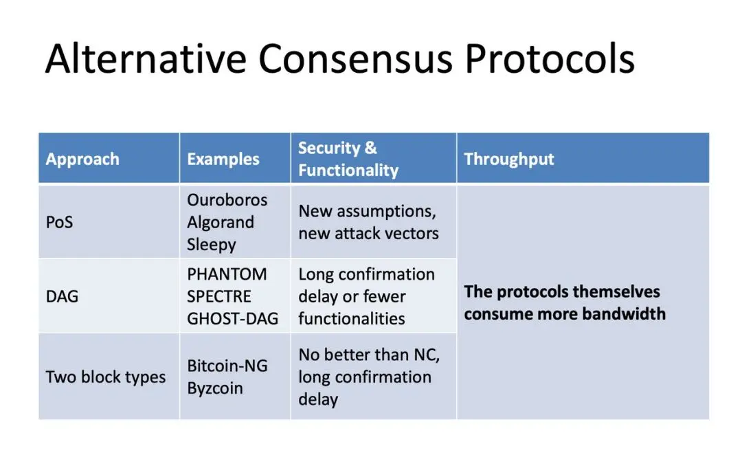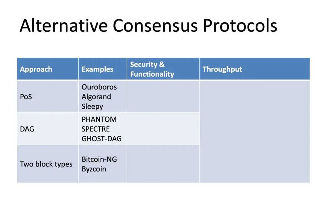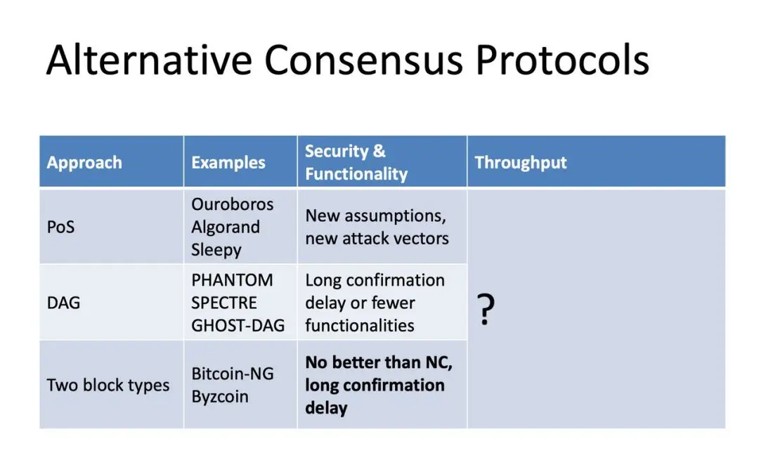 目前有三种替代 NC 的方式,它们分别是 PoS(Proof of Stake,权益证明),DAG 和两种区块类型的共识协议。注意这三种方式并不是相互排斥的,是有可能同时应用它们之中的 2-3 种的。下面我们来进一步分析这些协议的安全性、功能性和吞吐量。