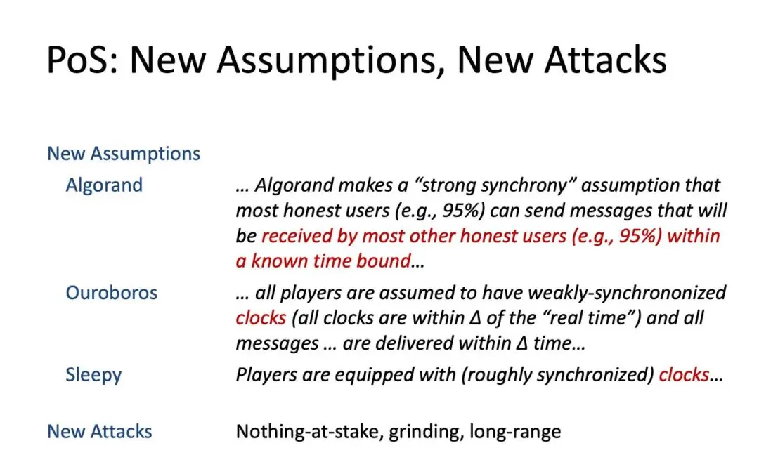 首先是 PoS,实际上所有的 PoS 协议引入了新的安全前提。拿 Algorand 举例来说,它要求大部分诚实用户发送的消息能够被大部分其他诚实用户在一个已知的时间范围内里面接收到。这意味着当你持有 Algorand 的 Token 时,根据协议最初的设计你需要时刻保持在线来接收消息。如果你不在线你就不是一个合格的 Token 持有者。