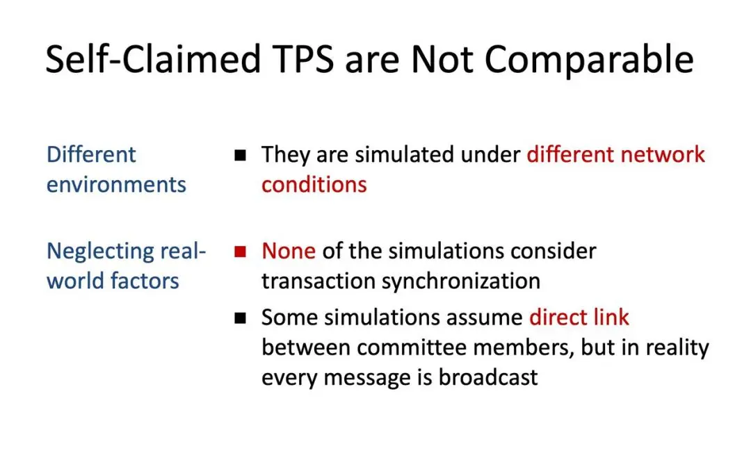 我们要注意的是,自称的 TPS 是没有可比性的。因为它们是在不同的网络环境中做模拟,某些模拟甚至使用 1Gbit/s 的带宽,显然这和现实网络情况相差甚远。
