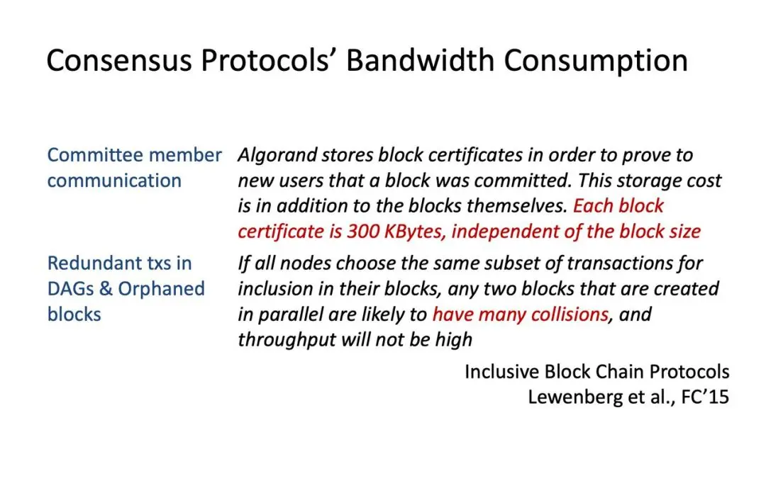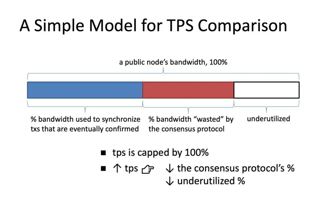 如上图所示,第一部分是用于同步最终确认的交易所占用的带宽比例,这一部分是真正的 TPS(This is the real TPS)。交易首先要被同步,之后才能进行交易确认。第二部分是被共识协议「浪费」的带宽所占的比例。第三部分是未被利用的带宽。