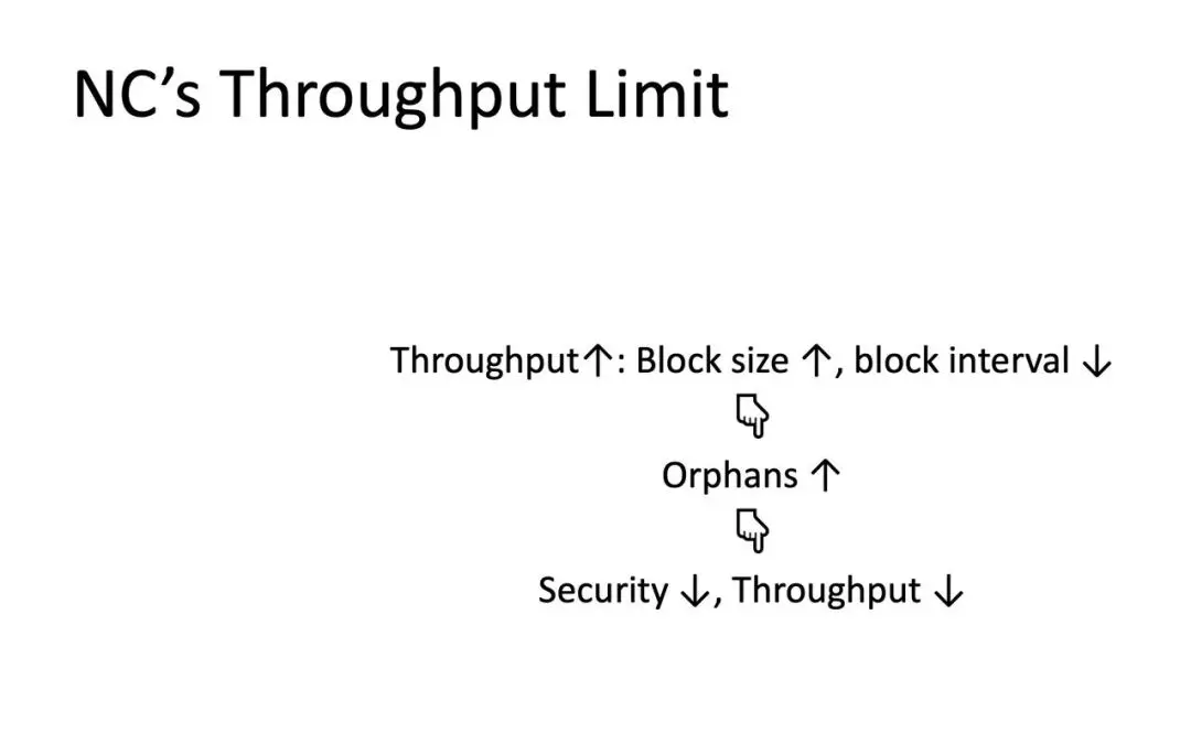 那我们如何打破 NC 吞吐量的限制呢?经过上面分析,如果我们想要打破这个限制,就必须降低孤块率。如果孤块率下降,那么网络的安全性和吞吐量都能够提高。