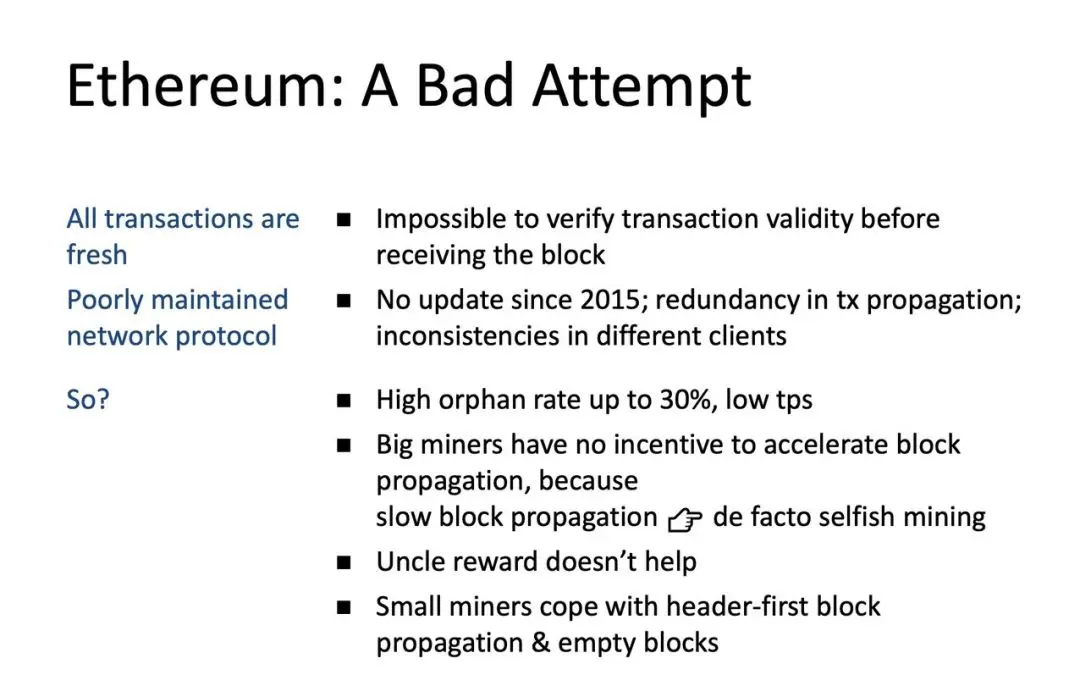 所以,以太坊是一个糟糕的尝试,我来分析一下他们是怎么做的。以太坊简单地缩短了出块间隔,但是以太坊有一个问题,就是它不能够在收到区块之前验证交易的有效性。因为在以太坊中一个交易的有效性依赖于区块中交易的顺序,因此如果你想要验证一个交易的有效性你必须等到整个区块都被接收到才行,这样的话每一个区块实际上都是 Fresh Transaction。