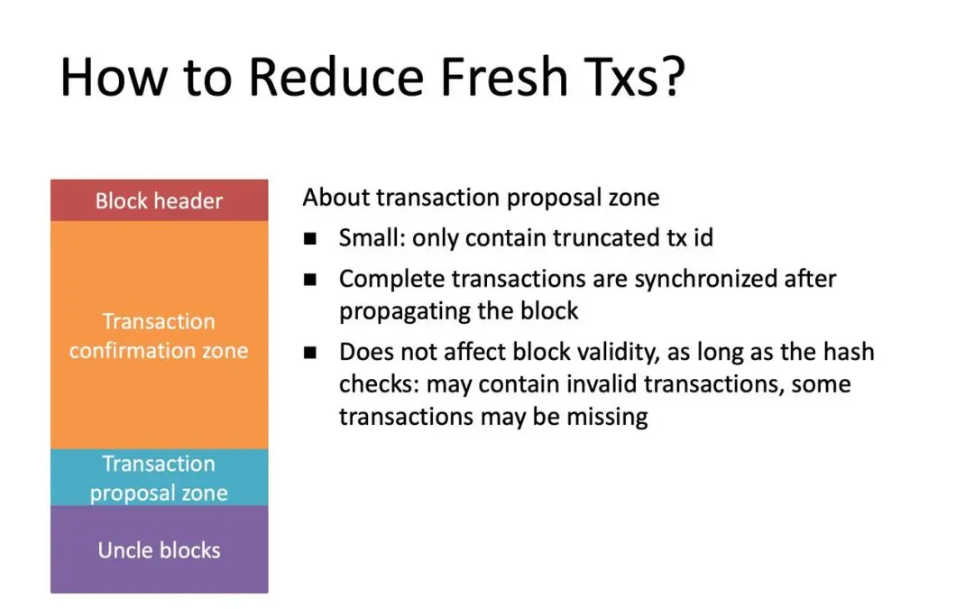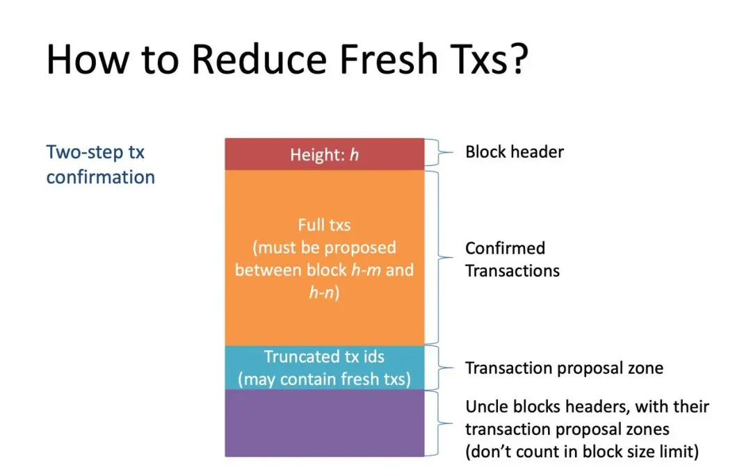 上图是我们的完整区块的区块结构。首先我们有一个交易提案区(青色区域)。只有交易提案区可包含 Fresh Transaction,而传统的交易确认区(橙色区域)只能包含前几个区块的交易提案区的交易,若当前区块高度是 h 的话,那么就是 h-m 到 h-n 区块的交易提案区内的交易。只有这些交易能够被确认,Fresh Transaction 不能被交易确认区确认。交易提案区不包含完整的交易,只包含交易 ID(Truncated Transaction ID),因此交易提案区会非常小。