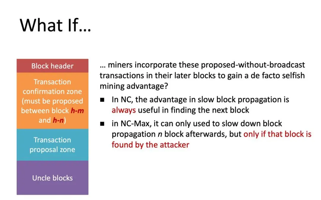 矿工只能够挖 h-m 至 h-n 个区块内的提案交易,但是不能挖前一个区块的提案交易,除非这个区块也是被攻击者挖到的。