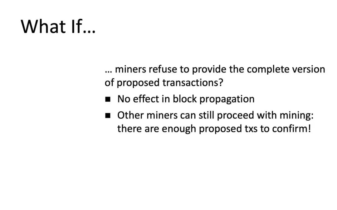 并且其他矿工也会继续挖矿,因为总是有足够的提案交易需要确认。该矿工也没有必要挖空块,因为之前区块的交易提案区包含了它将打包的这些交易 ID,已经被发现的区块在 Compact Block 中都广播了打包进的交易确认区的交易 ID,矿工都知道哪些交易被打包了哪些没有,不会选择和被发现区块交易确认区内相冲突的交易,因此矿工会选择继续打包交易出块并获得手续费,为交易确认做贡献。