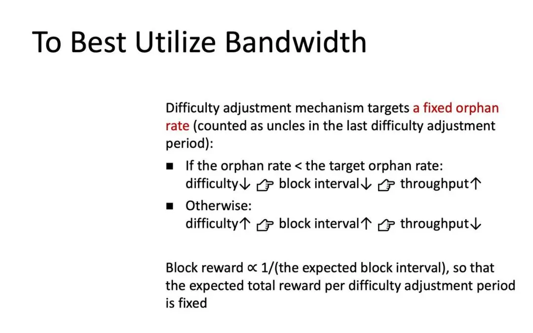 如果孤块率在上一个难度调整周期低于设定的孤块率,挖矿难度会降低,出块间隔将降低,吞吐量会提高。也就是说,更少的孤块意味着当前的网络状态实际上有能力更快地同步交易,我们能够在提高吞吐量的同时不损害网络的去中心化。