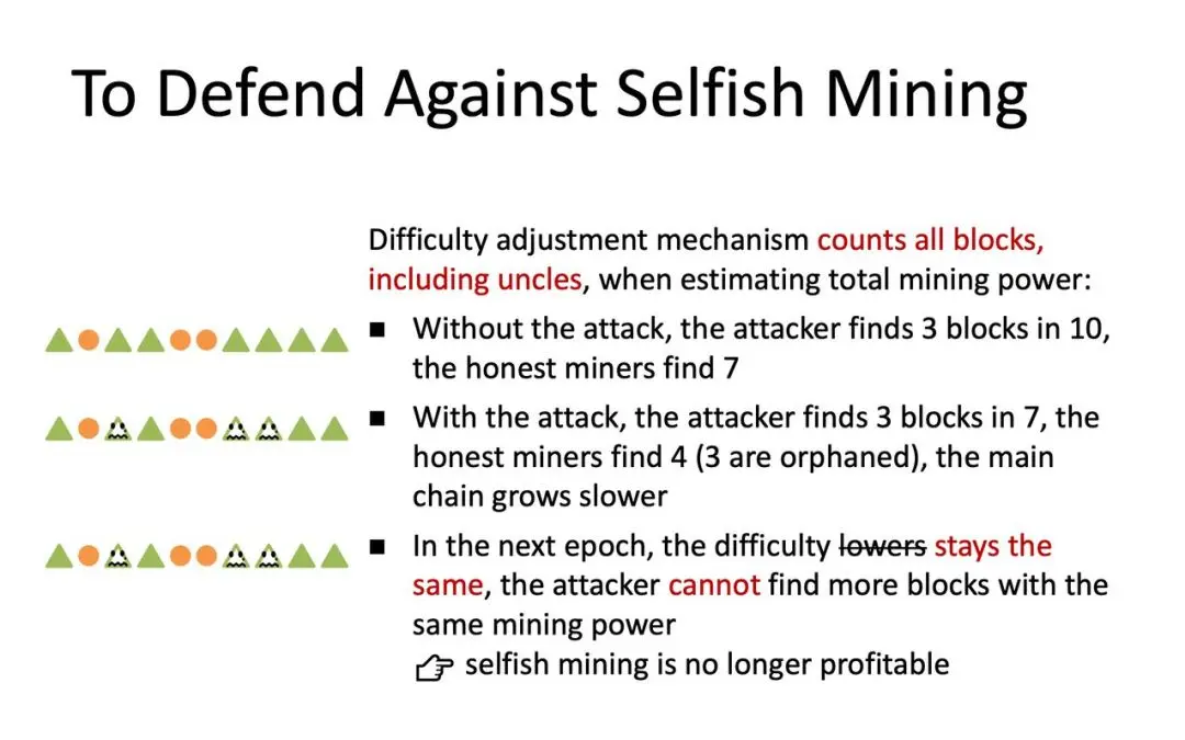 在下一个难度调整周期,难度会保持不变(因为难度会根据所有区块计算,包含孤块),攻击者并不能用同样的算力找到更多的区块,因此自私挖矿不再有利可图。