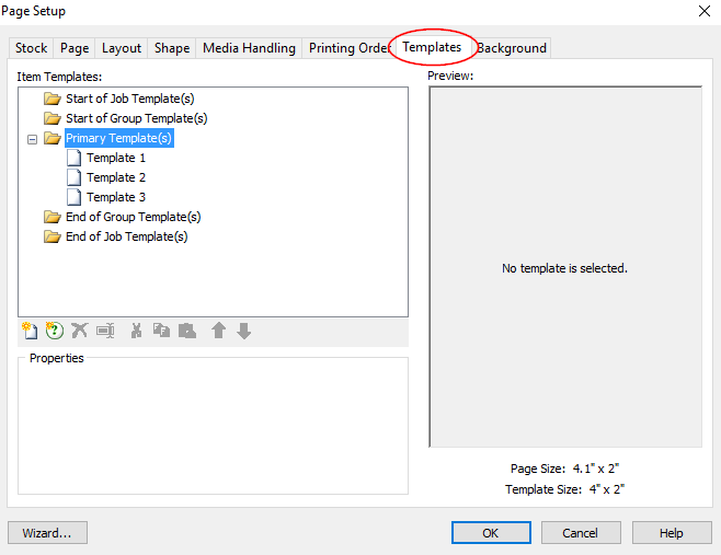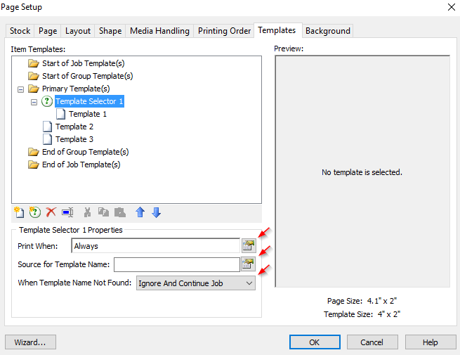 - 在“ 模板选择器属性” 部分中,指定包含要在“ 模板名称源” 字段中打印的模板名称的数据库字段或数据源值。