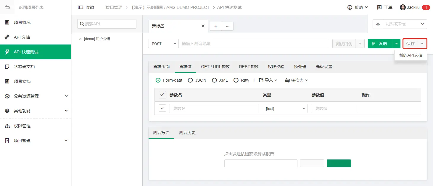 3.API快速测试支持搜索功能: 4.API快速测试支持将测试结果保存为API文档: