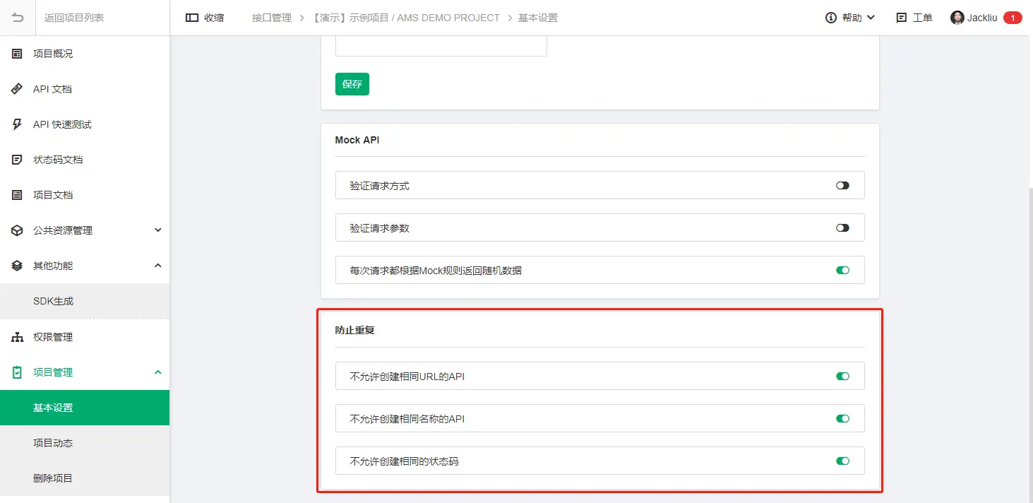 6.API项目设置加入API文档查重的设置选项: