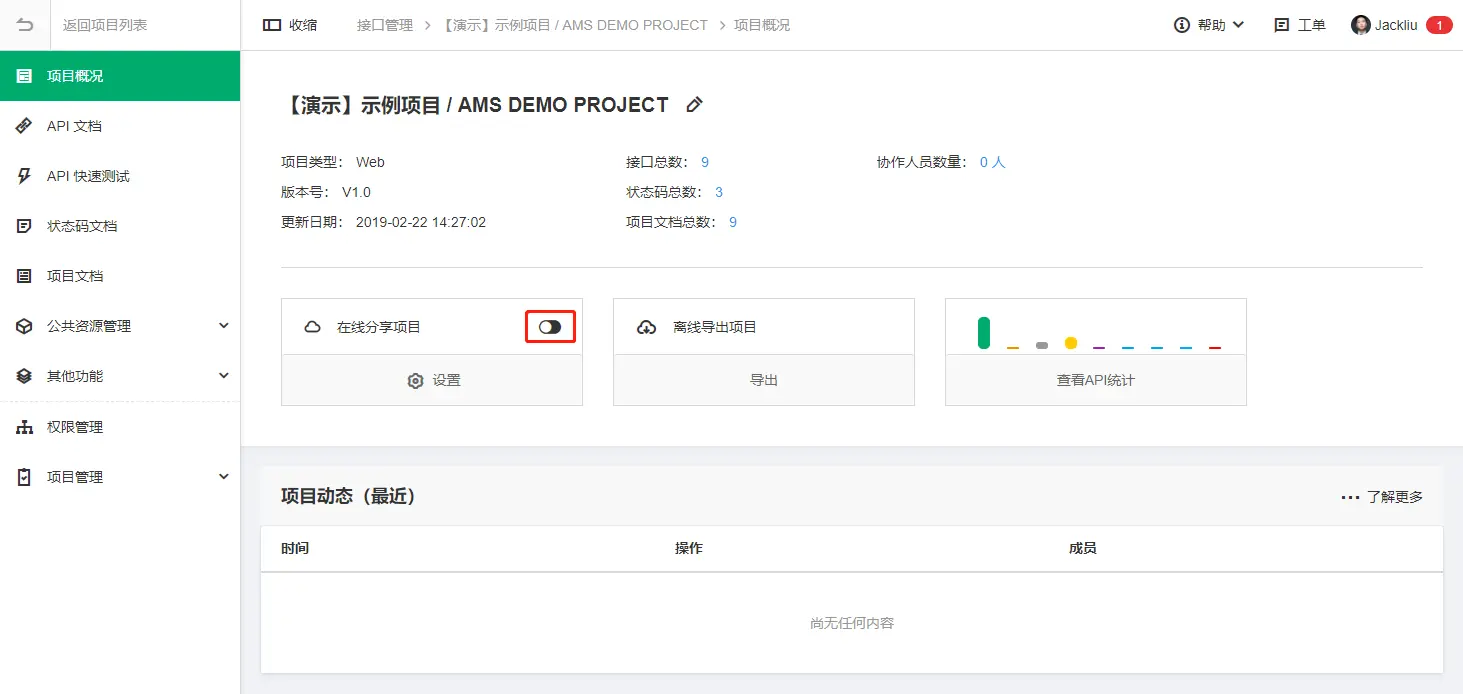 3.可以直接在项目概况页开启和关闭项目分享: