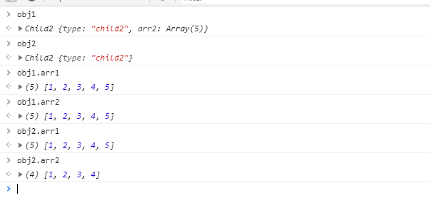 obj1.arr1.push(5)修改使得obj2.arr1的值也被修改。这显然不是我们想要的,我们希望各个实例之间是相互独立的。