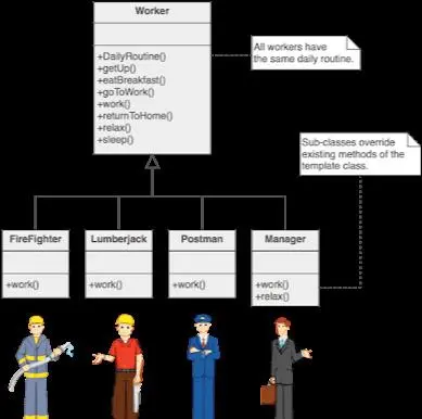 这是一个很好的图表,它很好地解释了模板设计模式。你可以看到每个人都有一些共同的任务,但他们做了不同的工作,并且很好地通过Template方法捕获。它们所需要定义的是它们的工作,它们通过将work()定义为一个抽象方法来定义它们的工作。