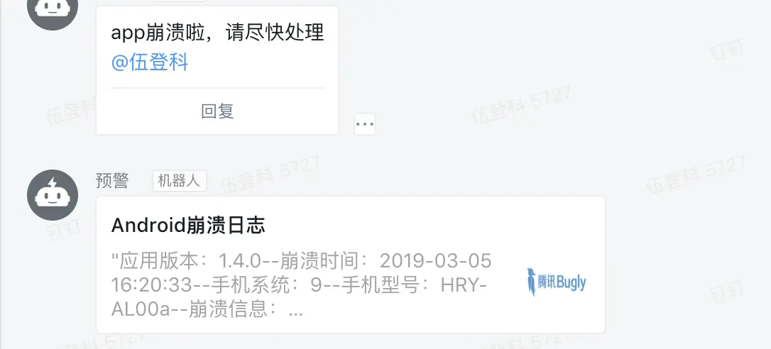 虽然在测试阶段已经会把这个过滤掉,但是实际使用时可能数据出错等等的原因都可能导致崩溃。这时我们最好接入Bugly,接入方法可以看官网,每次崩溃bugly都会记录。但是bugly每天只会推送一次,如果我们需要做一些预警,可以监听app崩溃做个通知发给钉钉机器人或者我们自己的后台方便我们做热修复。