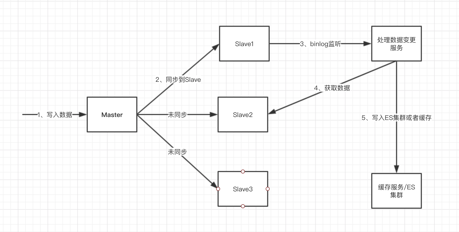 除了分库分表方案外,我们一般还会采用读写分离架构,将写流量请求到主库,读流量请求到从库。在笔者参与的供应链系统中,会监听从库的binlog变更,然后通过回调通知到处理数据变更的服务。 这个时候需要注意由于主从延迟,导致的数据不一致问题。主要流程如下图: