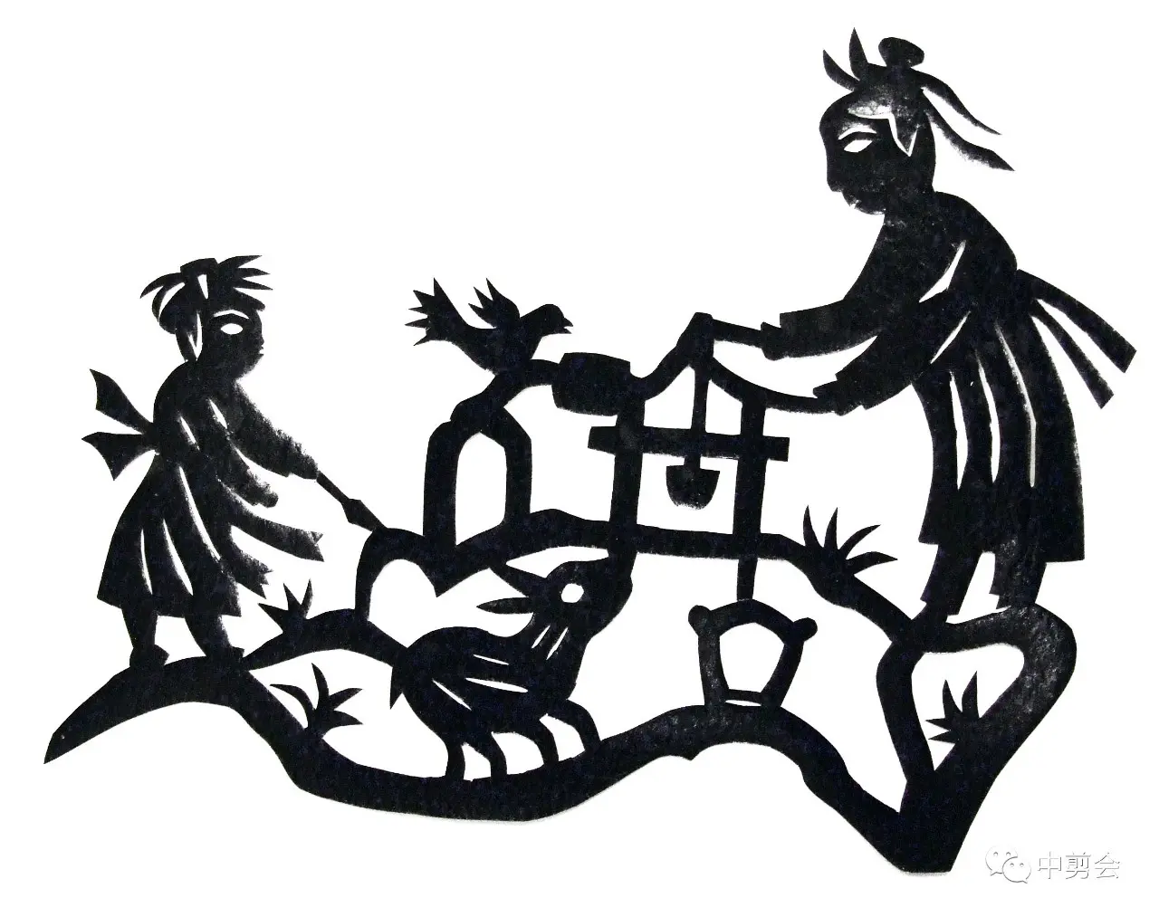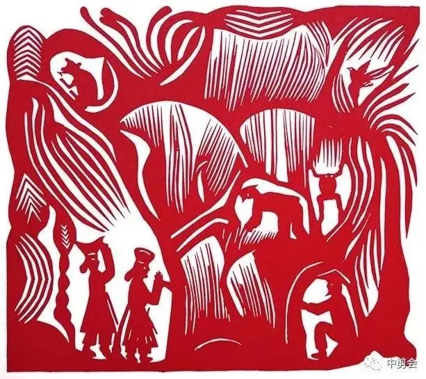 从1986年开始,中国美术馆陆续收藏了金雅贞、倪友芝和侯玉梅三位艺人近百套剪纸,这些作品不仅有从祖辈传承下来的样式,也有自己的创新,还有的在各类大赛中获得过奖项。这批作品可以分为四个类别,其一是表现满族图腾信仰的嬷嬷人(神)与回头鹿等动物。满族信奉萨满教,属多神崇拜,其中以祖先崇拜与自然崇拜相结合为最显著的特征。在诸神灵中,据说仅嬷嬷人就有160多种。嬷嬷人分管婚丧嫁娶等诸多事务,所以在满族民间得到广泛的崇拜。倪友芝创作的嬷嬷人为满族人扮相,正面站立,除了分开的手指和简单的五官外,几乎再无多余的细节与装饰(图2)。这种简单到极致的造型,充满肃穆而神秘的气息,如图腾般令人望而产生敬畏之心。其二为神话传说,如金雅贞的《罕王爷(努尔哈赤)的故事》(图3、4),倪友芝的《罕王降世》、《乾隆下江南》以及侯玉梅的《满族祖先布库里雍顺》等,主要根据长白山区流传的关于满族祖先的传说故事而创作。作者在继承传统的基础上,开拓了新的题材,充分展示了她们具有非凡的叙事能力和高超的艺术才能。其三是传统习俗,如金雅贞的《满族夫妻拜年》、《旗人结婚》,倪友芝的《端午节插艾草》等。最后一类是生活与劳作,代表作品有倪友芝的《老两口和小两口》(图5)、《挖参》(图6)等。这些作品以独特的视角和手法,表现了长白山区满族人传统的生活与习俗,风格粗犷、简洁、老辣,具有纪念碑式的意义。