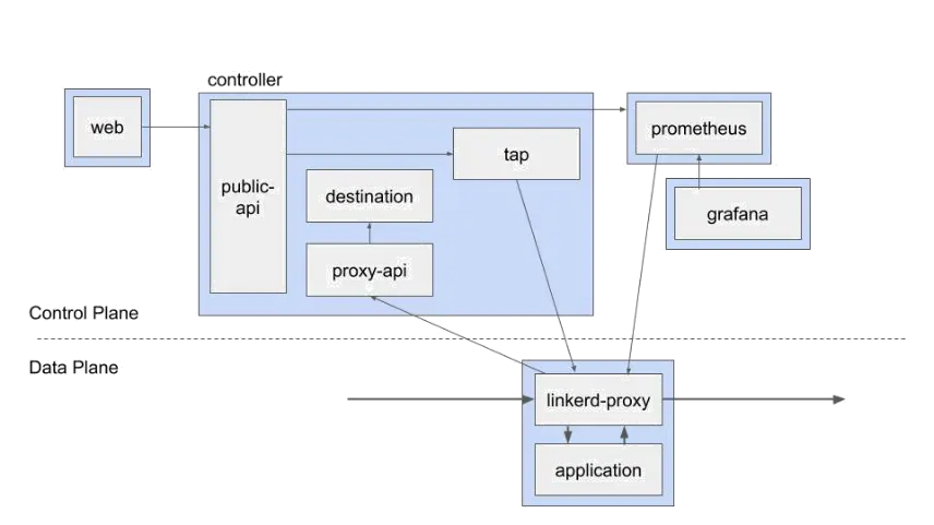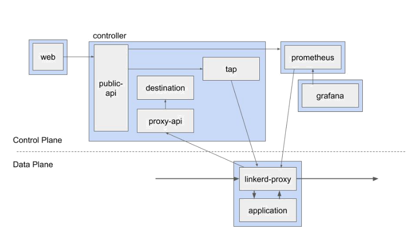 Linkerd2 整体上分为数据平面和控制平面两部分。为了能够更好的契合Kubernetes 容器环境,基于 Rust 和 Golang 重写 Linkerd 所有功能组件,主要包括控制器,管理控制台,数据采集器,数据展示平台。控制器(Controller)控制器部分有多个容器(public-api,tap,destination,proxy-api)组成,这些容器提供了控制平面的大部分功能。管理控制台(Web)
