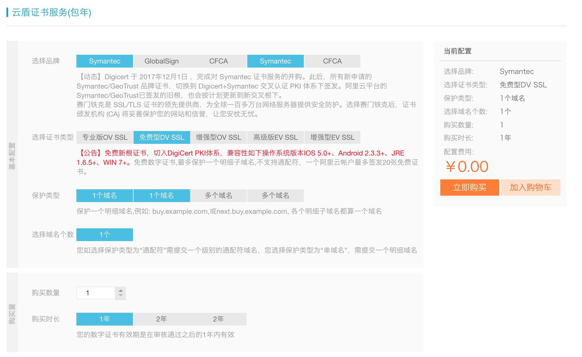 我购买的是阿里云的服务器,通过谷歌了解到阿里云是提供免费的SSL证书的,在如下的界面购买即可