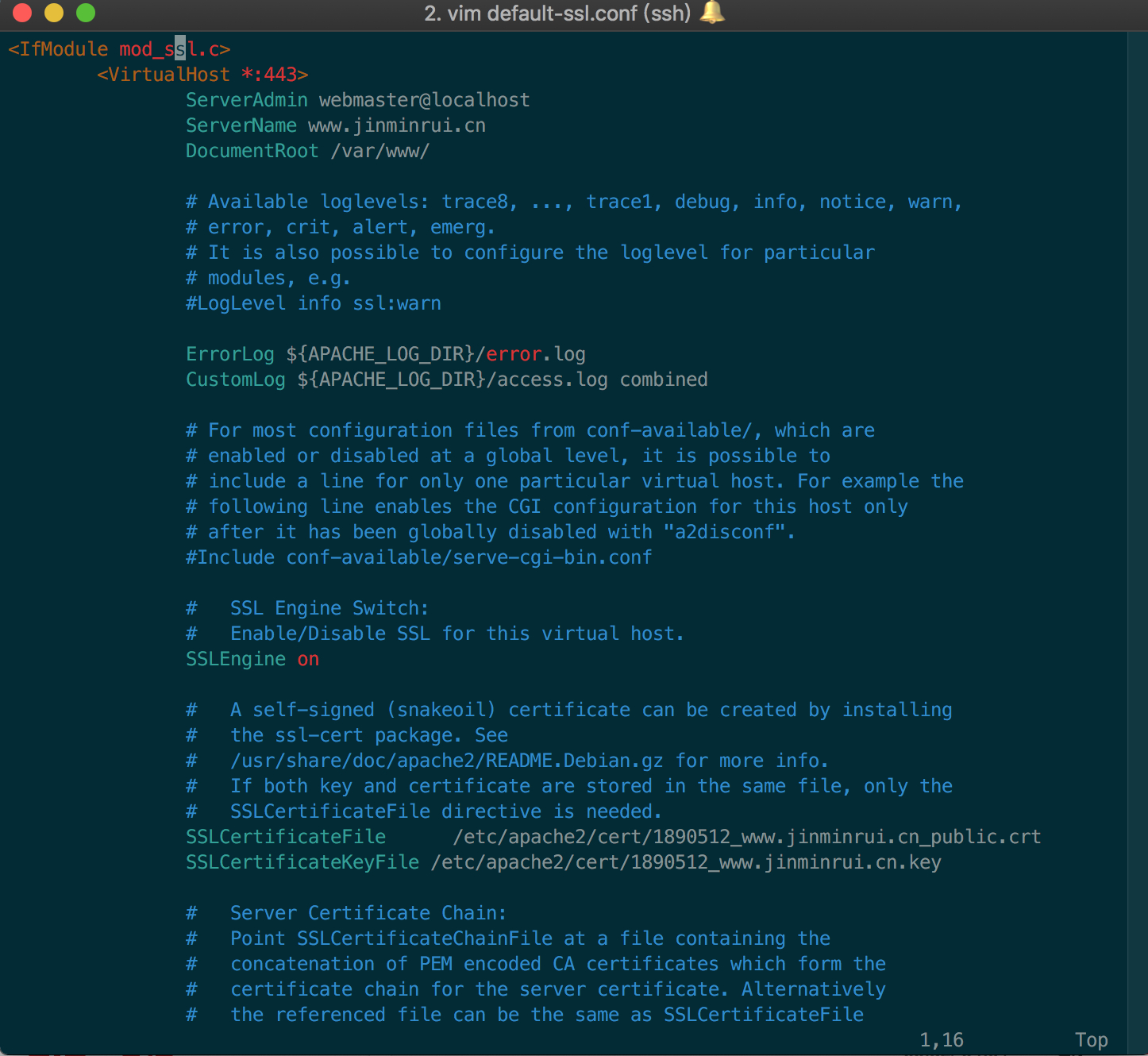 Apache加载SSL模块后,会在/etc/apache2/sites-available下生成default-ssl.conf文件,我们在终端使用sudo权限,通过vi编辑器打开。
